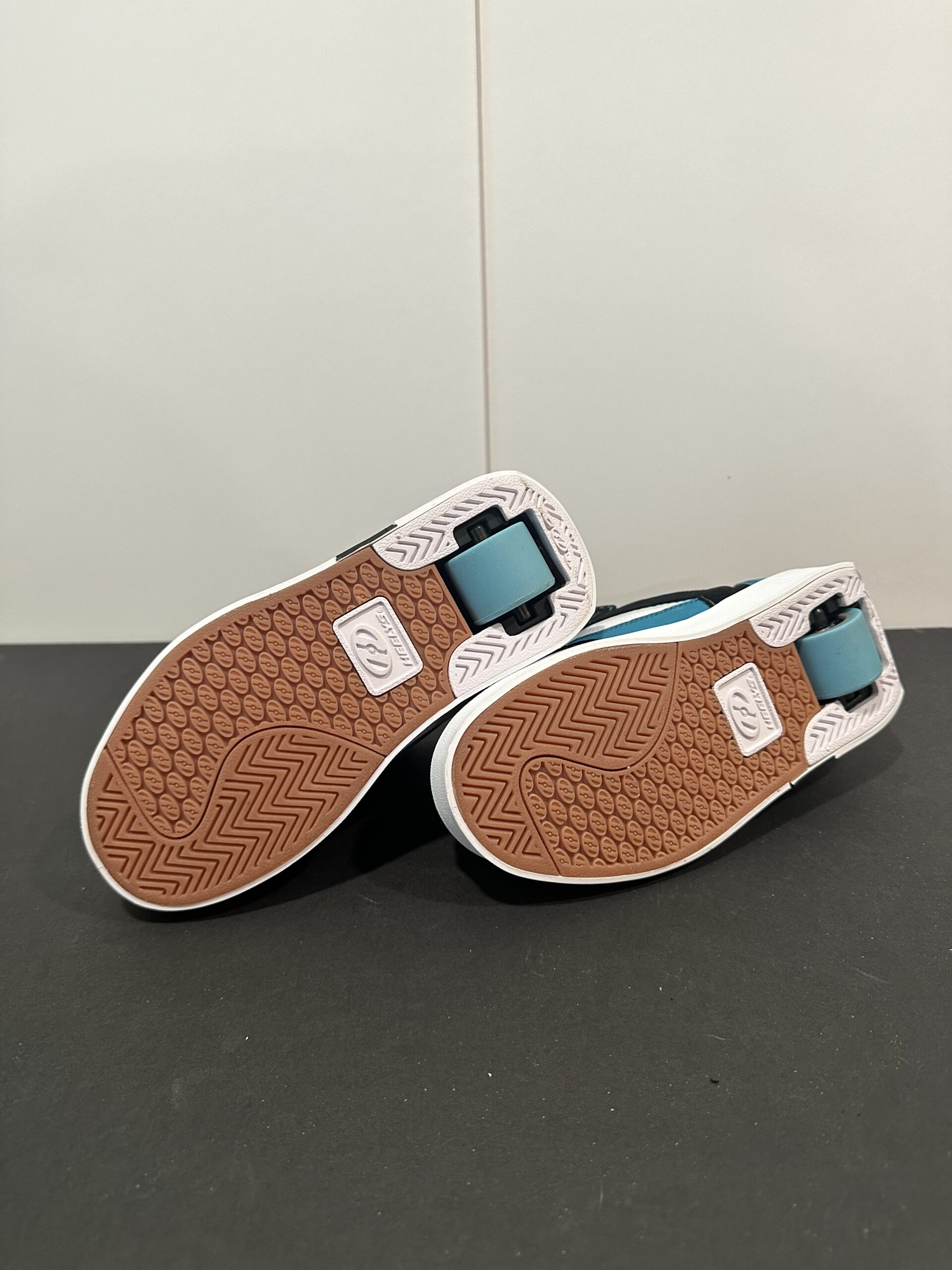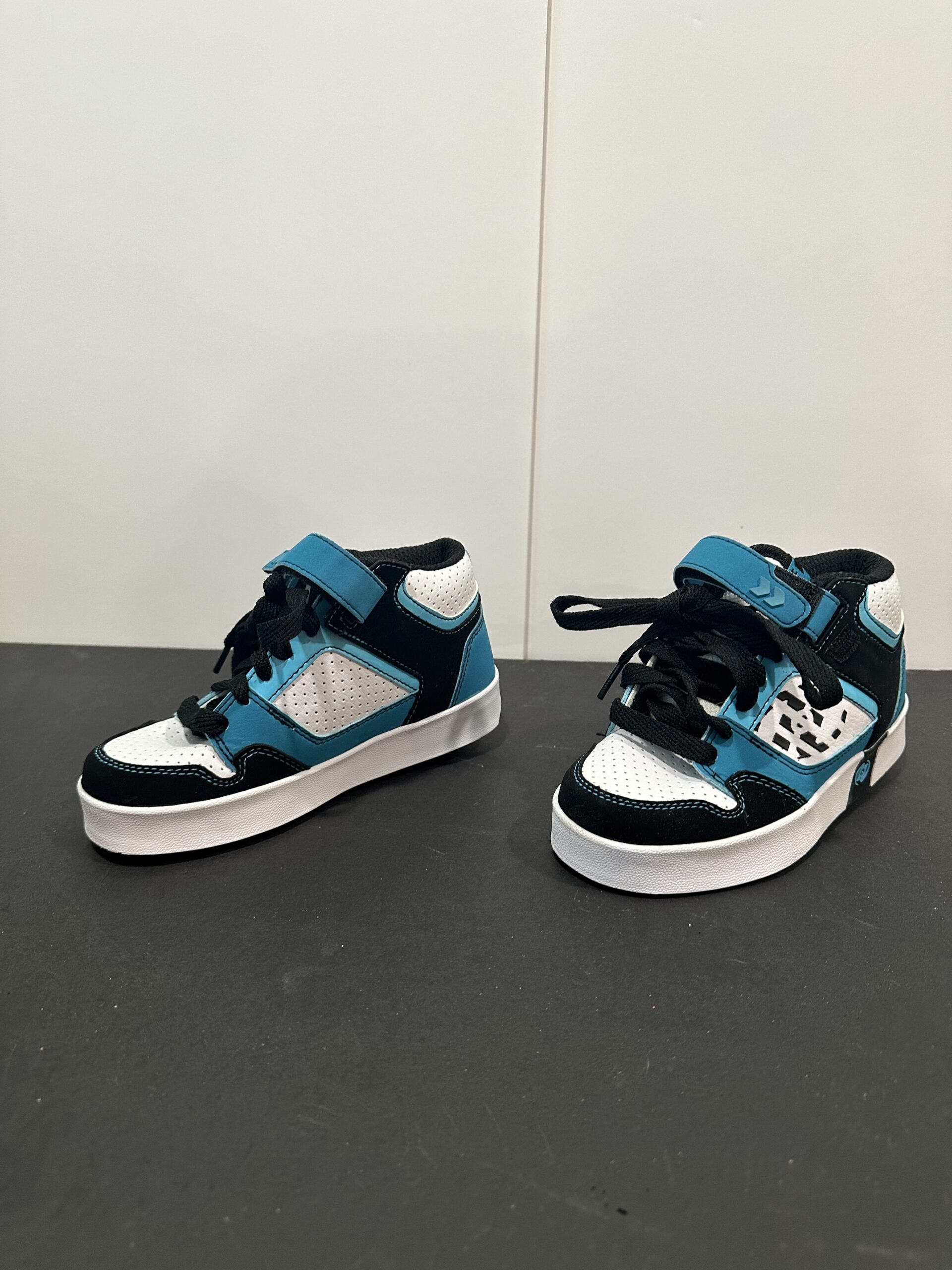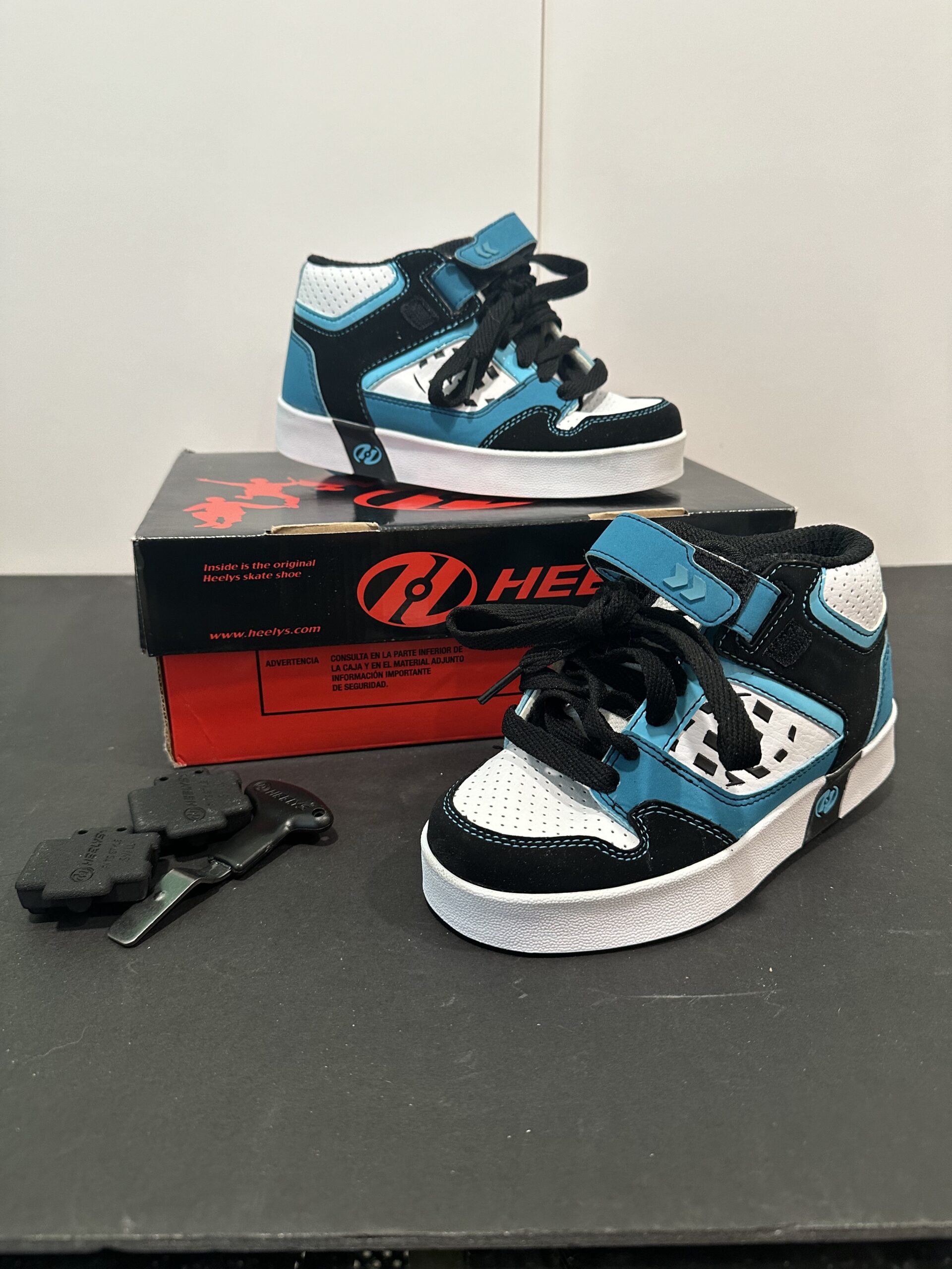 New! Never worn, Turquoise, White and Black Heelys, in original box. Size USA 1Y, UK 13 EUR 32